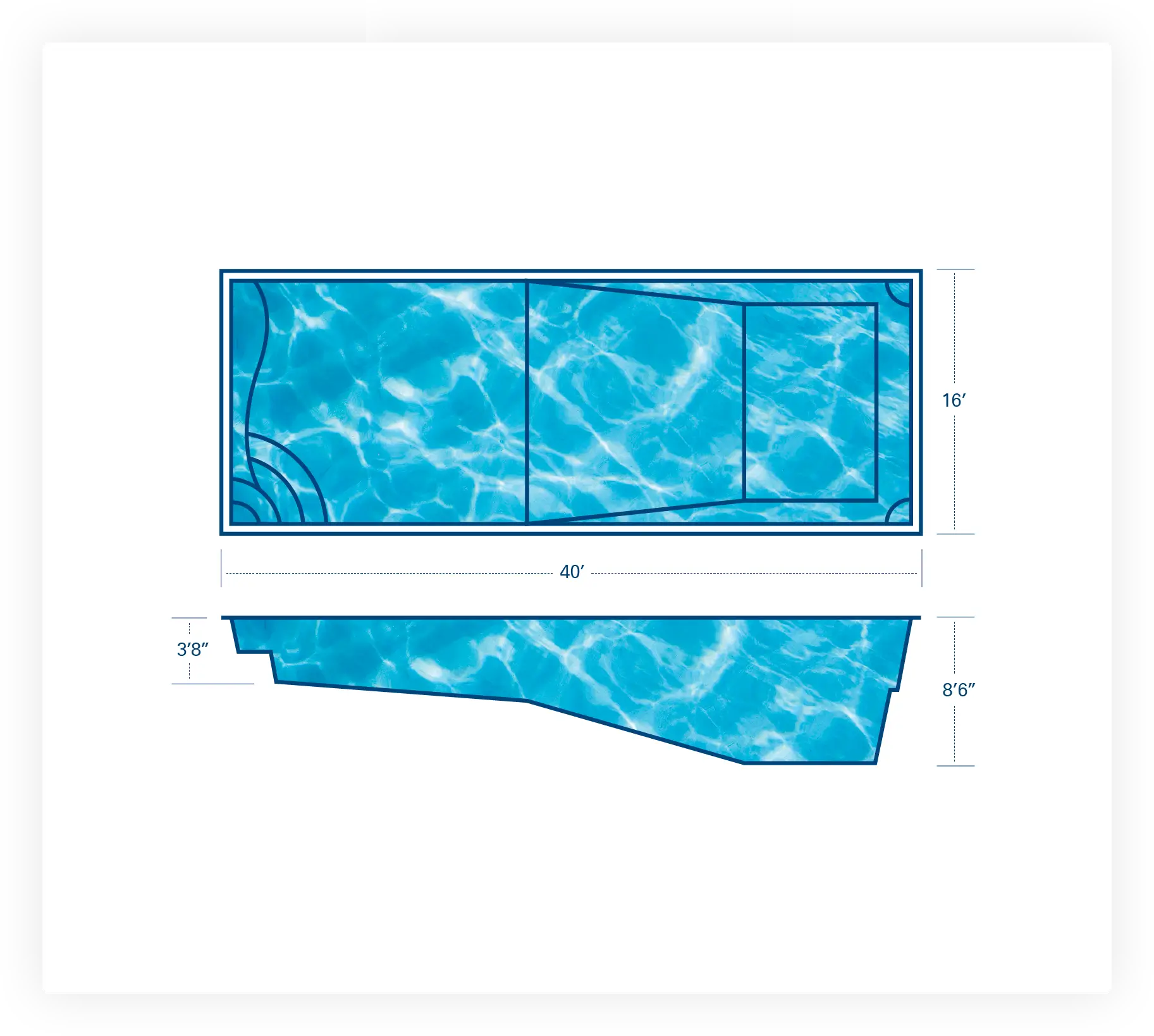 The T40 model boasts a spacious shallow-end bench seat, a generously sized shallow end for socializing and play, an open interior, deep-end seats with exit points, an impressive 8′ 6″ deep end, and is designed to accommodate automatic covers.